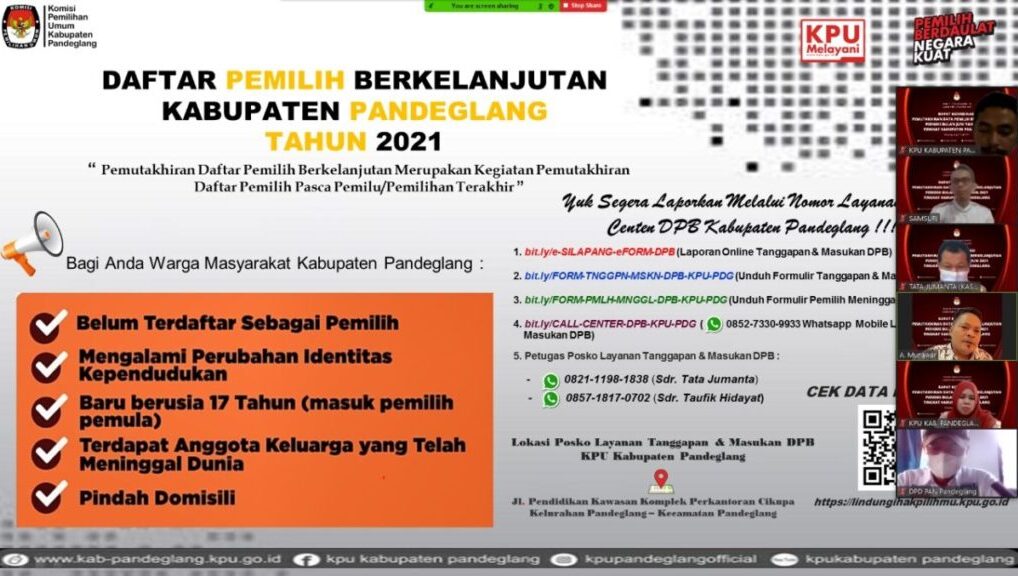 ruangpottlot.com, Pandeglang – KPU Kabupaten Pandeglang melaksanakan Rapat Koordinasi Pemutakhiran Data Pemilih Berkelanjutan (PDPB) Periode Bulan Juni Tahun 2021 pada Jumat (02/07/2021), dengan mengundang instansi/lembaga pemerintah terkait seperti KPU Provinsi Banten, Asda I Kab. Pandeglang, Bawaslu Kab. Pandeglang, Dandim 0601 Pandeglang, Polres Pandeglang, Pengadilan Negeri Pandeglang, Pengadilan Agama Pandeglang, Kejari Pandeglang, Disduk Pandeglang, BPS Pandeglang, Rutan Pandeglang, Disdikbud Kab. Pandeglang, Kemenag Kab. Pandeglang, DPMPD, DP2KBP3A serta Partai Politik Tingkat Kabupaten Pandeglang.